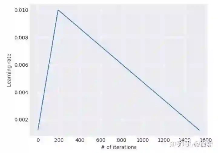 在finetune的第一阶段,希望能够先稳定住原来已经在大规模语料集上已经预训练好的参数,所以选择一个比较小的finetune学习率;尔后希望能够逐步加大学习率,使得学习过程能够尽量快速;最后,当训练接近尾声时,逐步减小学习率,这样让模型逐渐平稳收敛(这个思想大概借鉴了2017年谷歌提出Transformer时用到的warm up的学习率调节方法,这个方法也是在训练的时候先将学习率逐步增大,尔后再逐步减小)。因此,这样一个三段论式的学习过程,用图表示如下: