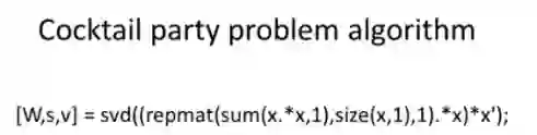 “鸡尾酒会”算法可能会得出结果:这可能是两种不同的声音混在了一起,并将两种声音分开。事实上,想要分离出两种声音,用Octave一行代码就可以完成对语音的分离工作(这里的Octave代码虽然只有一行但是这却用了很大的精力,这里算是通识介绍,如果是小白读者大可以不用太过在意):