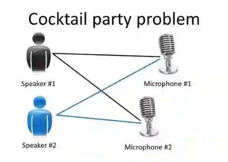 假设一个鸡尾酒会只有两个人,同时说话,房间里放置了两个麦克风,麦克风与人的相对位置不同,(或许第一个人的声音在麦克风1里要响一点,第二个人在麦克风2里要响一点)如下图: