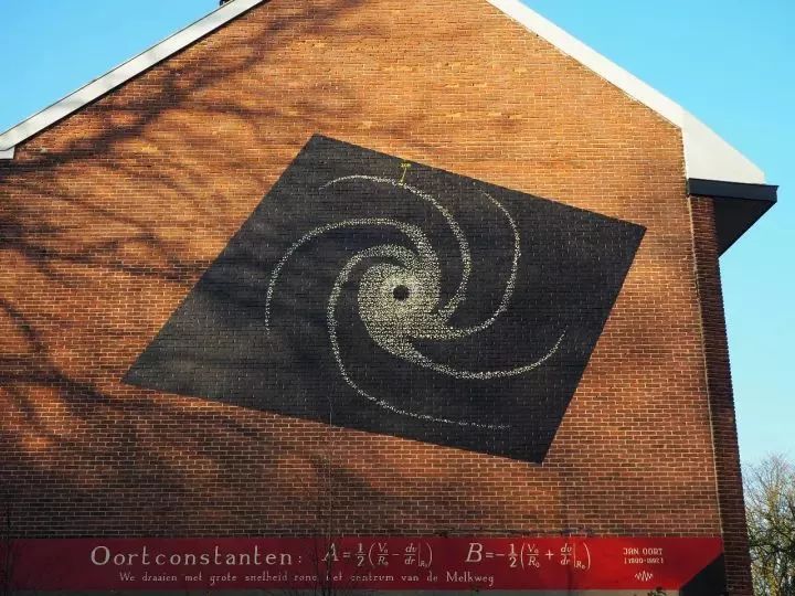 Van der Molen 说,这些公式就像诗歌一样,它们是现实世界的精华,“美丽且激励人心”。为了向非数学物理专业的人传达这些方程所饱含的意思,艺术家还用简单的图像来表示公式所描述的物理现象。例如,描述观察者在观察相对速度接近光速的物体时看到的长度收缩的洛伦兹收缩,被绘制成一个圆圈和一群“挤压”形成的椭圆。用来表述太阳围绕银河系中心运动的角速度的奥尔特常数,被绘制成了一个螺旋星系,并标注了我们的太阳所在的位置。为了展示爱因斯坦场方程中描述的时空会如何在大质量天体周围发生扭曲,艺术家在天体周围绘制了一条弯曲的光线传播路径,这个现象是我们熟知的引力透镜。通过这些美丽的线条,莱顿这座小城正率先用墙上的壁画去鼓舞她的公民,要拥抱物理和数学。