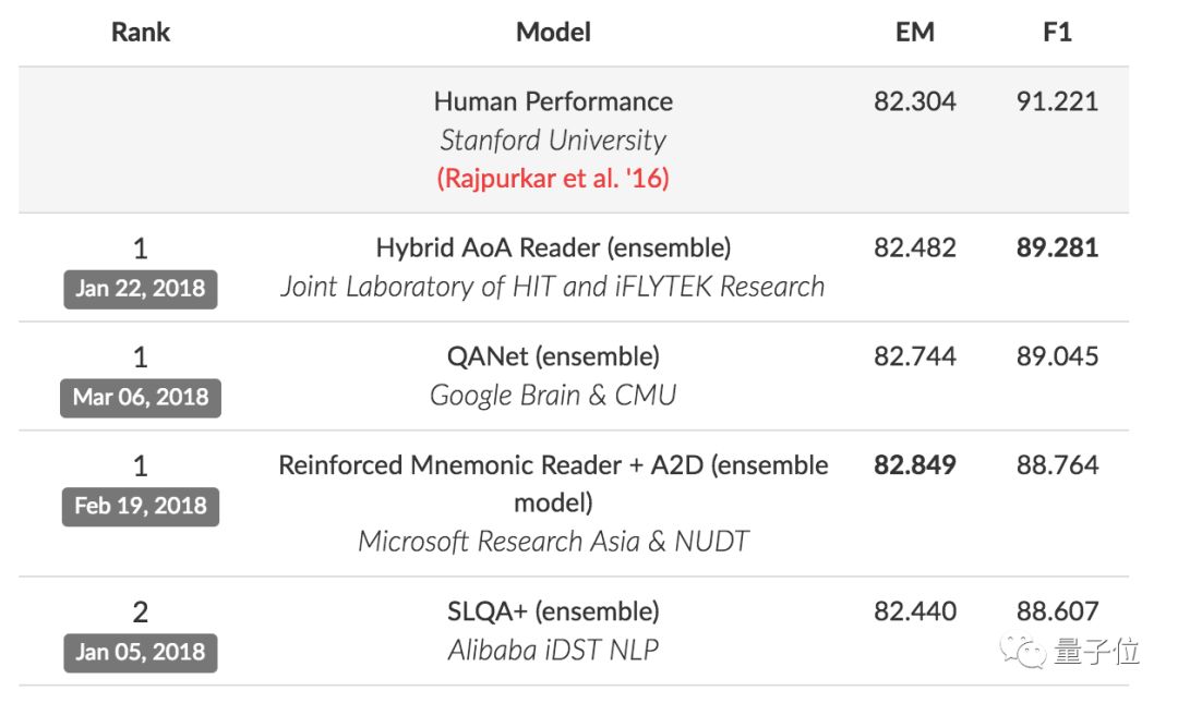 目前SQuAD有三个并列第一,除了哈工大讯飞联合实验室团队、微软亚洲研究院和国防科大联合团队之外,还有一个新面孔挤了进来:Google Brain和CMU联合团队。