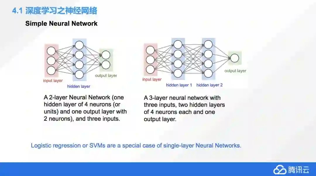 然后接下来我们就聊一聊现在非常热门,未来也会更加热门的图形学的深度学习方法。下面有两个深度学习的网络,所谓的深度学习实际就是深度神经网络,叫深度神经网络大家更容易理解。左边那个是一个两层的神经网络,这里要解释一下,我们一般说神经网络的层数是不算输入层的,两层就是包括一个输入层,一个隐层,和一个输出层。所以有的时候,如果我们提到了一个单层网络,其实就是只有输入层和输出层,大家知道这种情况下面的浅度神经网络是什么?它就是我们传统的机器学习里非常经典的逻辑回归和支持向量机。