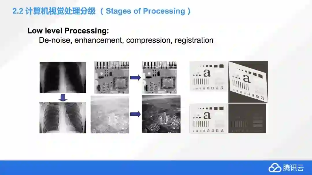 这边有一些例子是帮大家去理解 Low level Processing。比如左上那张是我们拍 X 光会看到的图,上面那张图是原始的 X 光的图片,大家可以看到,非常的不清晰,很难去理解到里面的骨骼,血管在什么位置。但通过 Low Level Processing 的降噪和优化,就能非常清晰的看到这个病人的所有的骨骼及内脏的位置。