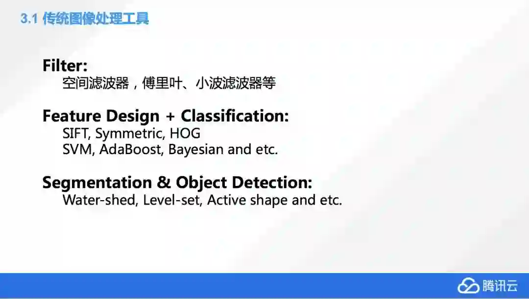 首先提到几个滤波器,包括空间滤波器,傅里叶、小波滤波器等等,这些都是我们经常对图像进行初期的处理使用的滤波器。一般情况下,经过滤波以后,我们会对图像进行 Feature Design,就是我们要从图片中提取一些我们觉得比较重要的,可以用来做进一步的处理的一些参照的一个信息,然后利用信息进行分类,或者分割等等,这些应用,其中一些比较经典的一些方法,包括 SIFT、Symmetry、HOG,还有一些就是我们分类会经常用到的一个算法,包括 SVM,AdaBoost,还有 Bayesian 等等。