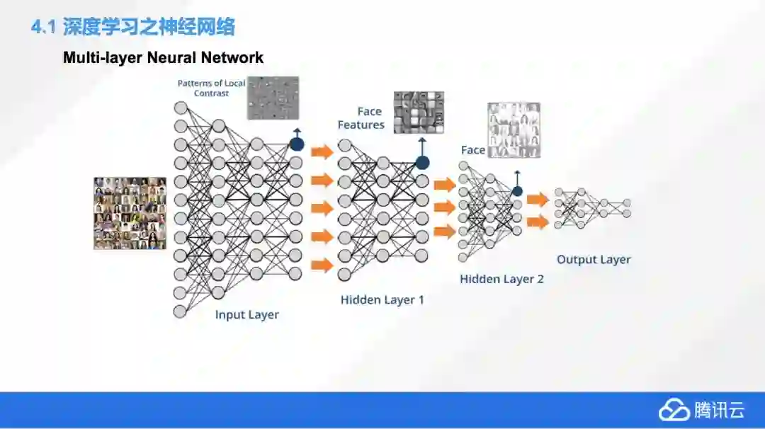 这个是对多重人脸识别设计的一个深度神经网络,我们可以看到输入层中间会做一些预处理,包括把图片转换成一些对比度图。第一个隐层是 Face Features,从人脸上提取关键的特征值。第二个隐层就是开始做特征值匹配,最后的输出层就是对结果进行输出,一般就是分类。