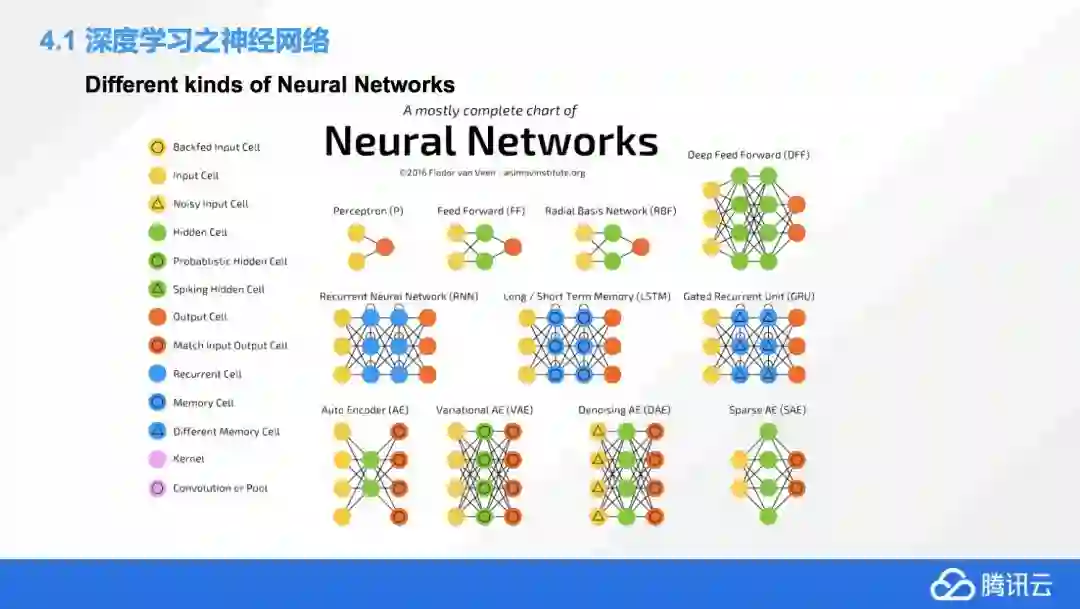除了刚才我们看到的典型神经网络,还会有其他各式各样的网络?有三角形,也有矩形的,矩形中间还有菱形的。神经网络出现了以后,改变了大家的一些工作方式。之前,大部分机器学习的科学家是去选择模型,然后选择模型优化的方式。到了深度学习领域,大家考虑的是我们使用什么网络来实现我们的目的,实际上还是区别比较大的。