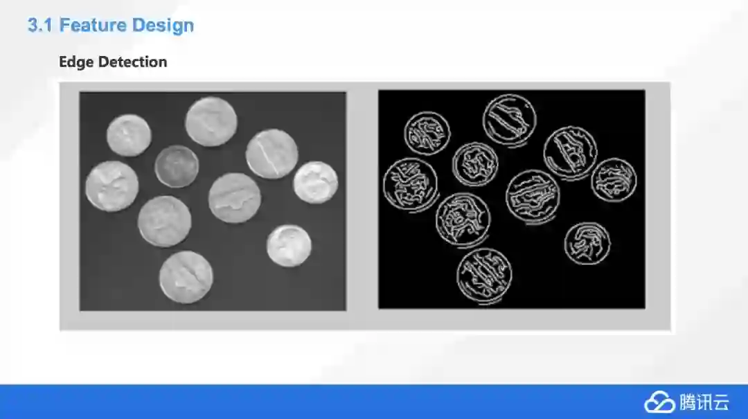 举个例子,硬币包括上面的图案,都会经过简单的 Edge Detection 全部提取出来,但实际上Edge Detection 在一些比较复杂的情况上面,包括背景复杂的情况下,它是会损失很多信息的,很多情况下我们看不到边缘。