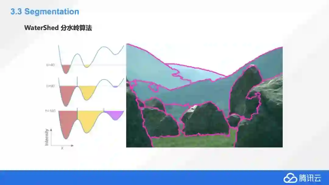 这个也是一个非常经典的分割方法,叫分水岭算法,就是把这个图像想象成一个地理上的地形图,然后我们对其中的各个山谷非常无差别的统一往里面放水,总会有一些山谷先被填满漫出来,那我们为了阻隔他们水流的流动就要建一些这种堤坝,这也是分水岭算法的名字的由来。利用这种方式,我们建坝的地方就是很好的一个图像的分割的这种界线,大家可以想象一下,把左边这张图和右边的边界联系起来,就会理解到这个算法是个非常巧妙的事。