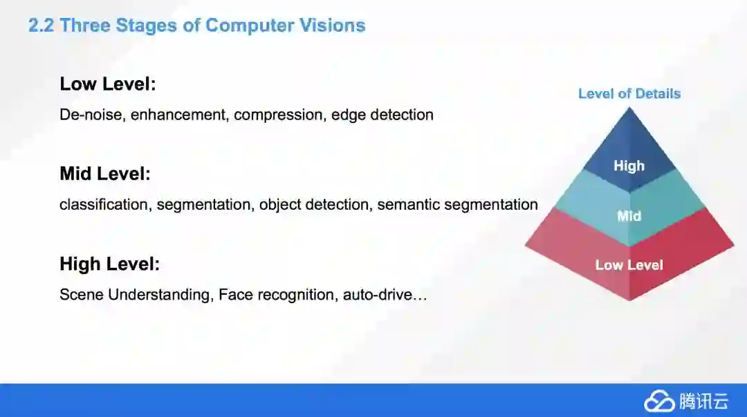 举一个简单例子,比如 Low Level 上面我们可以做图像的降噪、优化、压缩、包括边缘检测,不管是哪一条,我们都是可以想象一下,我们是离这个图片非常近的去看这个细节。High level 是什么?包括情景理解、人脸识别、自动驾驶,它基本上是从一个比较远的角度来看这个大局。