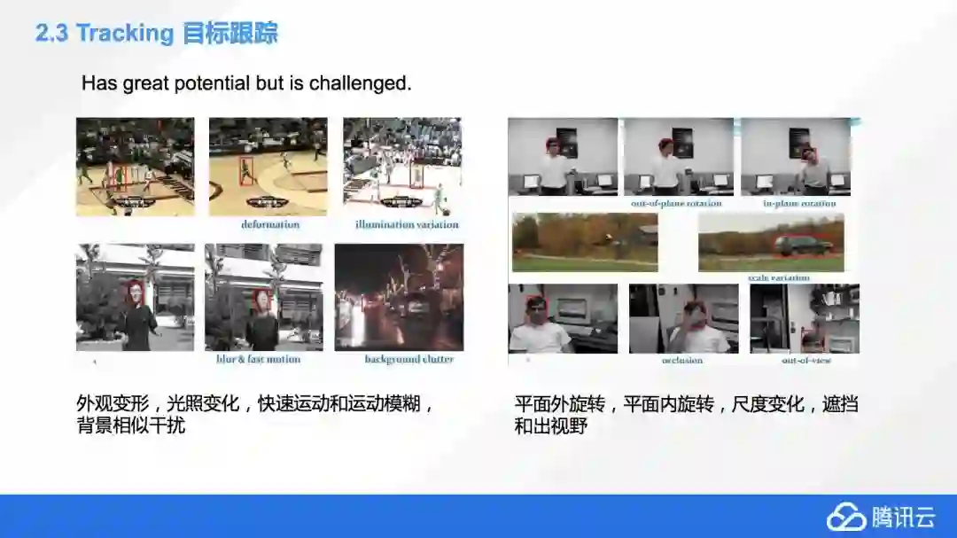 实际上对机器来说,这是一个很有挑战性的任务,为什么呢?因为机器在追踪对象的时候,大部分会使用最原始的一些方法,采取一些对目标图片进行形变的匹配,就是比较早期的计算机识别的方法,而这个方法在实际应用中间是非常难以实现的,为什么?因为需要跟踪的对象,它由于角度、光照、遮挡的原因包括运动的时候,它会变得模糊,还有相似背景的干扰,所以我们很难利用模板匹配这种方法去追踪这个对象。一个人他面对你、背对你、侧对你,可能景象完全不一样,这种情况下,同样一个模板是无法匹配的,所以说,很有潜力但也很有挑战性,因为目前对象追踪的算法完全没有达到人脸识别的准确率,还有很多的人在不断的努力去寻找新的方法去提升。
