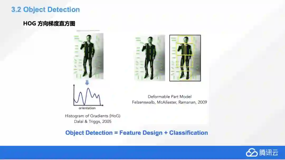 另外一个比较流行的方法叫 HOG 方向梯度直方图,比如像这张图片上显示,在图像中间,局部目标的表象和形状能够对灰度的梯度、还有边缘方向的密度有很好的表示。比如像这张图像,人身上的梯度就是向着上下方向。而对于背景,由于背景光的原因,如果我们做灰度的分析,会发现它的梯度是偏水平方向的,利用这种方式我们就很容易的可以把背景跟前景进行分割。另外如果很多小框里的梯度方向几乎一致的话,我们就可以认为它是一个对象,这个方法是很好的可以塑造一个分割的效果。实际上很早期的目标检测就是 Feature Design,所以说检测是基于分类的,也是这个意思。现在深度学习引入以后,很多理论也发生了一些变化,待会详细介绍一下。