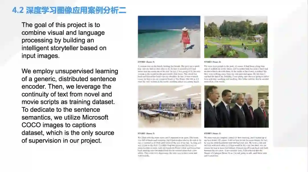 这个项目除了最先我们对图像里面的对象识别过程使用的是监督学习,其他的都是非监督学习。这个系统是可以自然的去套用到很多不同的地方,只要换个不同的文章数据库,它就可以讲不同的故事。一些例子就是根据不同的图片,比如左上角这张是我觉得分数最高的:有一个女性在沙滩上面走路,经过我们的模型就输出了一个非常浪漫的故事,基本上符合这个情景。