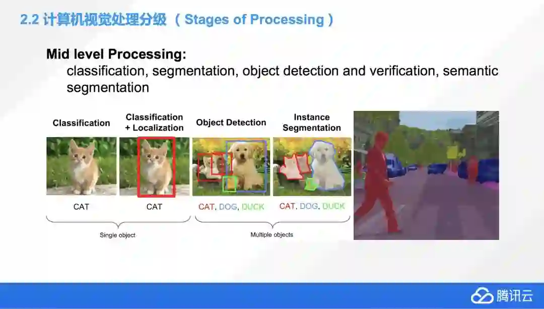 这个是 Mid level Processing,目前这块的技术比较成熟。这块的应用包括分类、分割、目标检测,也包括情景检测、情景分割,甚至还有意图检测,就是通过看图片里面的一些物体和他们目前在做的一些行为来判断他们的意图。