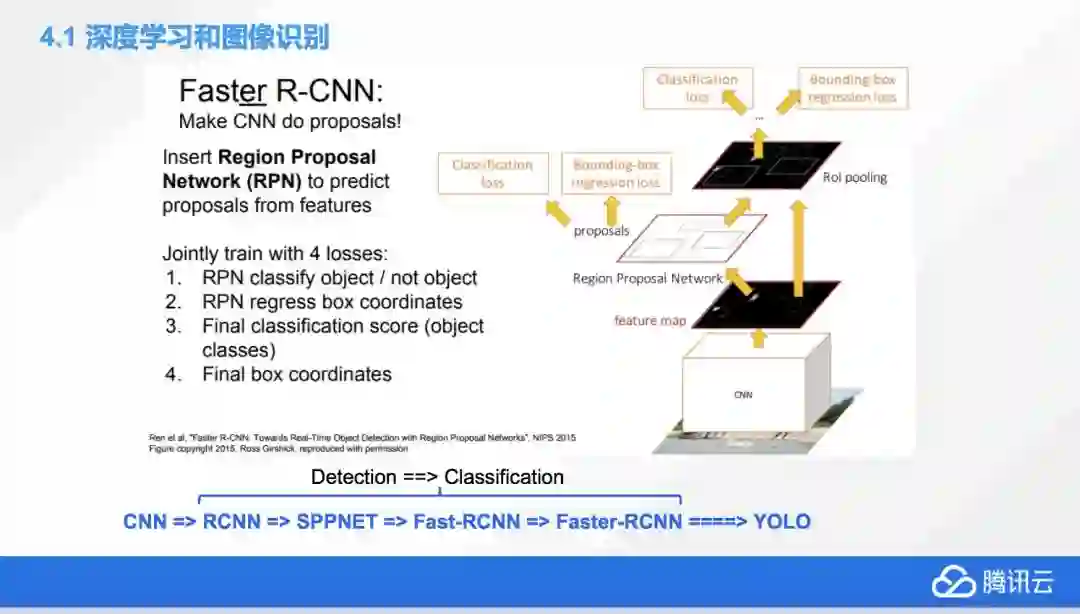 再举一个例子,目前比较流行的做图像分割的还有很多基于 CNN 的新网络。比如在 CNN 基础上大家又加入了一个叫 Region Proposal Network 的东西,利用它们可以去优化传统 CNN 中间的一些数据的走向。Faster-RCNN 不是一蹴而就的,它是从RCNN中借鉴了 SPPNET 的一些特性,然后发明了 Fast-RCNN,又在 Fast-RCNN 的基础上进一步的优化变成了 Faster-RCNN。