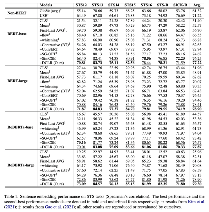 我们在 7 个数据集上进行了语义相似度测试,并与现有 baseline 进行比较。可以看到,DCLR 的性能在绝大部分实验中优于基线模型。