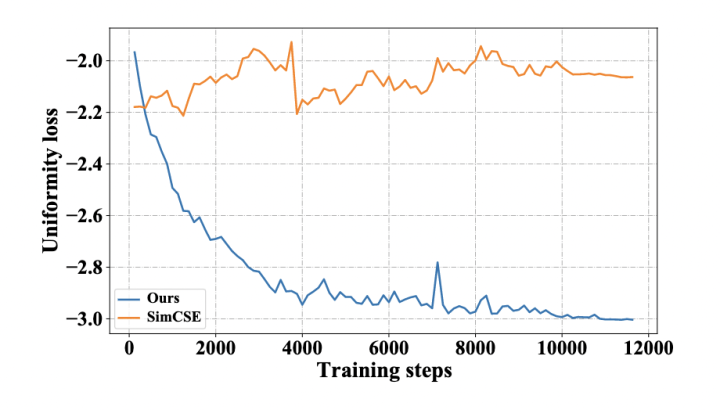 均匀性是句表示的一个理想特征。我们比较了 DCLR 和 SimCSE 基于 BERT-base 在训练期间的均匀性损失曲线。遵循 SimCSE,均匀性损失函数为: