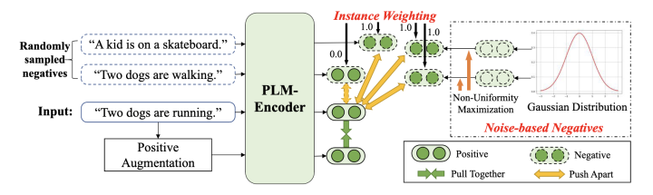 DCLR 聚焦于减少句表示对比学习中负采样偏差的影响。在这个框架中,我们设计了一种基于噪声的负例生成策略和一种惩罚假负例的实例加权方法。