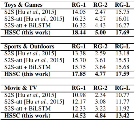 表 1:我们的模型和抽象式摘要的序列到序列基准在 Amazon SNAP 测试集上的比较。这个测试集包含三大领域:玩具&游戏、运动&户外、电影&电视。RG-1、RG-2、RG-L 分别表示 ROUGE-1、ROUGE-2、ROUGE-L。