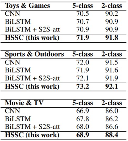 表 2:我们的模型和情感分类的序列到序列基准在 Amazon SNAP 测试集上的比较。这个测试集包含三大领域:玩具&游戏、运动&户外、电影&电视。5-class 和 2-class 分别表示五类情感和二类情感分类的准确度。
