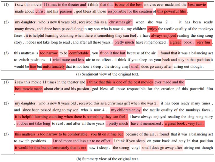 表 4:多视角注意的可视化。上部分是情感视角注意的热图,下部分是摘要视角注意的热图。颜色更深表示注意分数更高。
