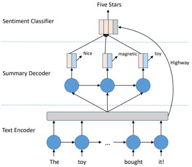 大多数现有的模型要么是为摘要设计的,要么就是为分类设计的。对于抽象式文本摘要而言,最受欢迎的是序列到序列模型 [Sutskever et al., 2014; Rush et al., 2015],其中生成长源文本的短摘要可以被看作是长序列和短序列之间的映射。这种模型由一个编码器和一个解码器构成。编码器将源文本编码成一个隐含表征,解码器则生成摘要。某些近期的抽象式摘要模型是序列到序列模型的变体 [Chopra et al., 2016; See et al., 2017]。对于情感分类,大多数近期的研究都使用了神经网络架构 [Kim, 2014; Tang et al., 2015](比如 LSTM 或 CNN)来生成文本嵌入,然后使用多层感知器(MLP)根据这个嵌入预测标签。