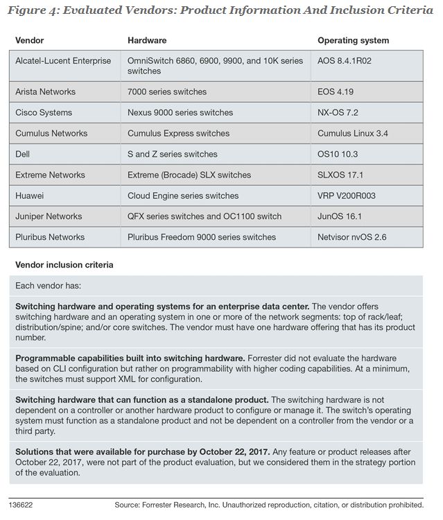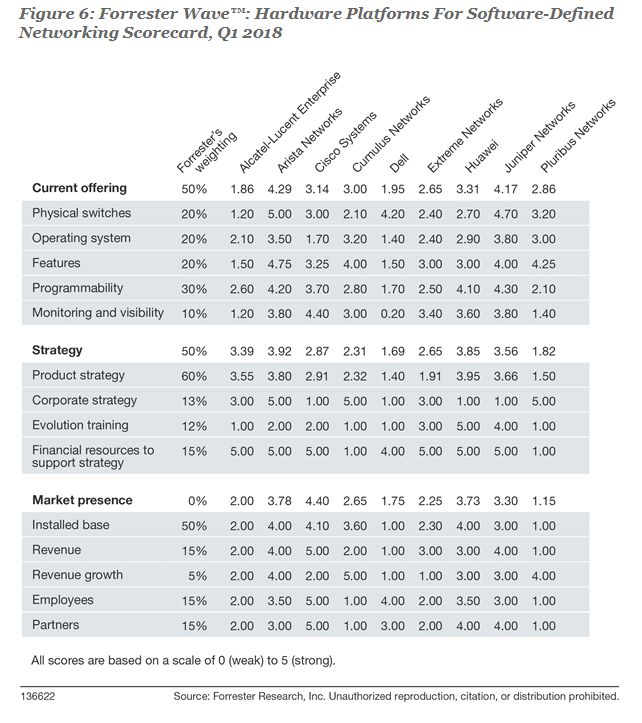 Forrester评估了九家供应商:阿尔卡特朗讯、Arista Networks、极进网络、思科、Cumulus Networks、戴尔、华为、瞻博网络和Pluribus Networks。这每一家供应商都有这些(见下图):