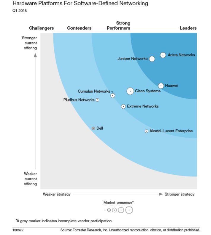 Arista Networks、瞻博网络和华为跻身领导者:Forrester的研究报告发现,Arista Networks、瞻博网络和华为是这个市场的领导者。思科、Cumulus Networks和极进网络提供颇有竞争力的解决方案。阿尔卡特朗讯、Pluribus Networks和戴尔落在后面,不过仍是竞争者。