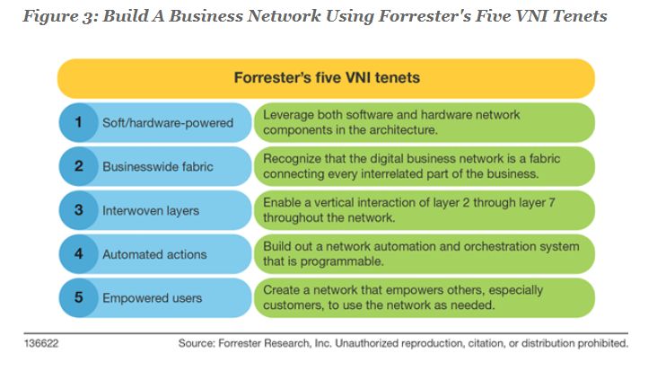 支持Forrester所谓的虚拟网络基础设施(VNI)框架出现。为了构建全公司虚拟网络,可编程数据中心网络交换机是支持和满足Forrester的VNI五大原则的一个必要部分(见图3)。