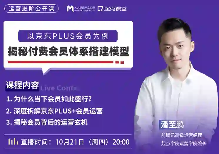 为此,我们特邀了前腾讯高级运营经理、社交平台运营负责人、起点学院运营学院院长@潘至鹏老师,在10月21日(今晚)晚上20点,通过1个小时的直播,给大家深度剖析会员盛行背后的关键因素,揭开会员背后的运营增长逻辑。