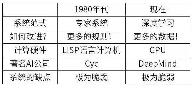 看起来似乎不太乐观,似乎深度学习只是以往的机器学习方法的再次错误重现。不过也有许多人反驳,虽然认同两个时代的智能系统都面向非常狭窄的任务、都非常脆弱,但如今的系统已经确实广泛运用在了各种系统中,为全世界人民提供了实实在在的价值。