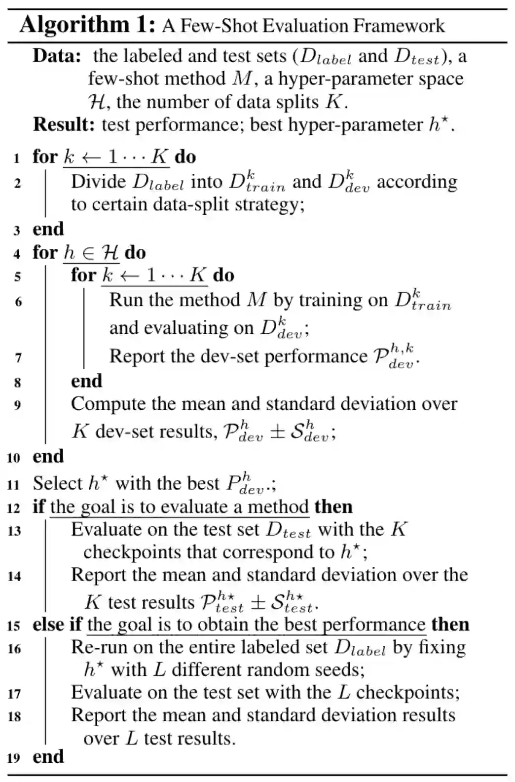 本文为小样本自然语言理解提出一种更稳健且有效的评价框架,如算法 1 所示。