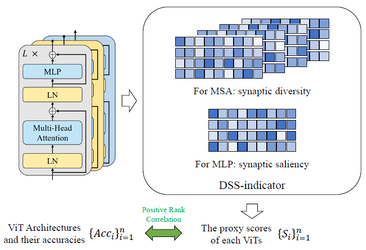 研究者设计了一个有效且高效的零代价代理评估指标 DSS-indicator(下图 2),并基于此设计了一个包含模块化策略的无训练 Transformer 结构搜索算法(Transformer Architecture Search,TF-TAS)。