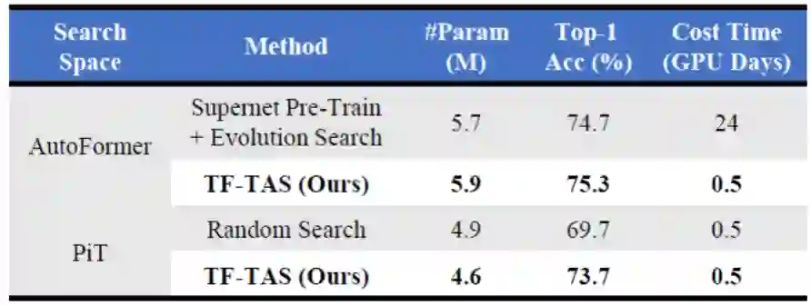 具体来说,DSS-indicator 通过计算 MSA 的突触多样性和 MLP 的突触显著性来得到 ViT 结构的评价分数。这是学术界首次提出基于 MSA 的突触多样性和 MLP 的突触显著性来作为评价 ViT 结构的代理评估指标。而且需要注意的是,TF-TAS 与搜索空间设计和权值共享策略是正交的。因此,可以灵活地将 TF-TAS 与其他 ViT 搜索空间或 TAS 方法相结合,进一步提高搜索效率。与人工设计的 ViT 和自动搜索的 ViT 相比,研究者设计的 TF-TAS 实现了具有竞争力的效果,将搜索过程从 24 GPU 天数缩短到不到 0.5 GPU 天数,大约快 48 倍。