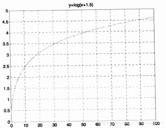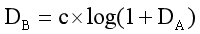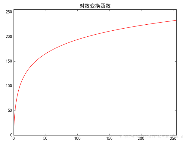 其中c为尺度比较常数,DA为原始图像灰度值,DB为变换后的目标灰度值。如下图所示,它表示对数曲线下的灰度值变化情况。