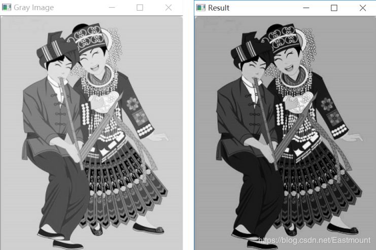 下图表示经过伽玛变换处理后的效果图,伽马变换对于图像对比度偏低,并且整体亮度值偏高(或由于相机过曝)情况下的图像增强效果明显。