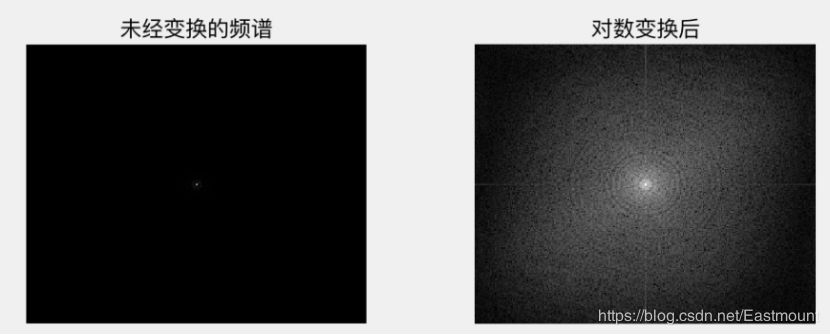 对数变换实现了扩展低灰度值而压缩高灰度值的效果,被广泛地应用于频谱图像的显示中。一个典型的应用是傅立叶频谱,其动态范围可能宽达0~106直接显示频谱时,图像显示设备的动态范围往往不能满足要求,从而丢失大量的暗部细节;而在使用对数变换之后,图像的动态范围被合理地非线性压缩,从而可以清晰地显示。在下图中,未经变换的频谱经过对数变换后,增加了低灰度区域的对比度,从而增强暗部的细节。