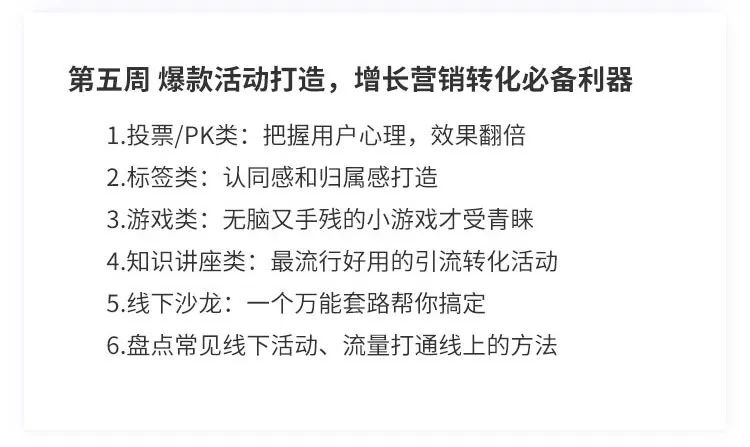 第五周:掌握7大类营销活动玩法,能独立操盘线上、线下活动,实现引流转化