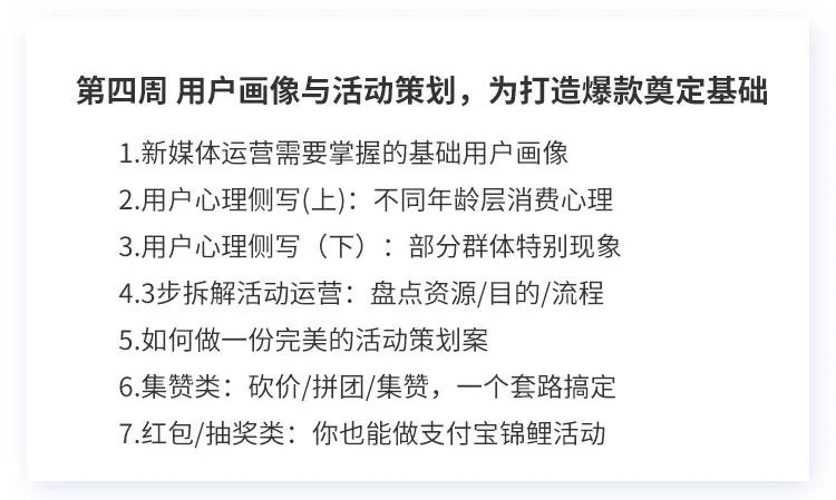 在《新媒体运营实战班》中,罗老师不仅会教会我们盘点活动目的、活动资源、活动流程等,以及如何做一份完美的活动策划案,还讲解集赞类、投票/PK类、标签类、红包/抽奖类、游戏类、知识讲座类、线下沙龙类等7大不同类型的运营套路。