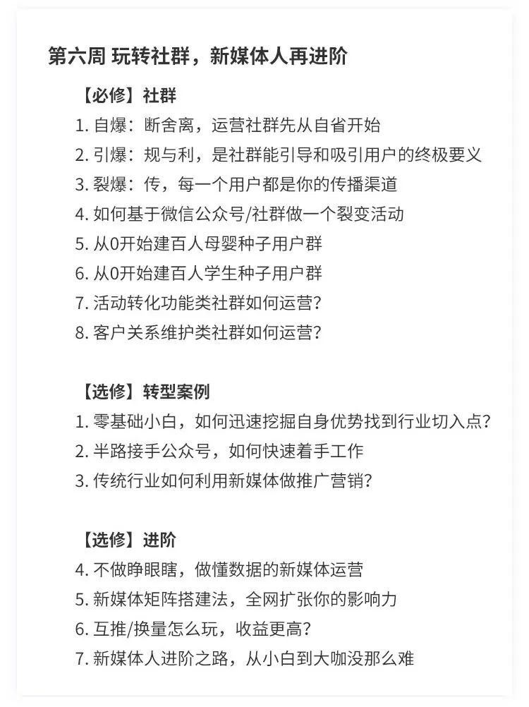 第六周: 掌握社群裂变、营销、运营必备能力,熟悉数据分析、矩阵搭建等进阶技能
