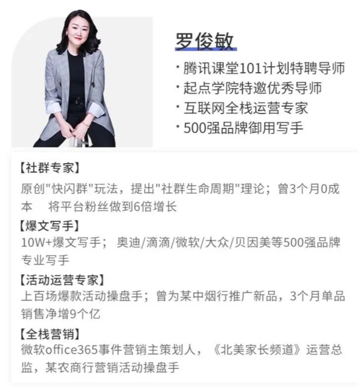 在《新媒体运营实战班》中,罗老师会先从用户画像和用户心理侧写帮我们更深地理解用户,再从用户群的选择、规则制定、福利诱惑、传播渠道、用户关系维护等角度带领我们从0到1建立百人种子用户群,实现低成本高效运营用户,达成转化的目的。
