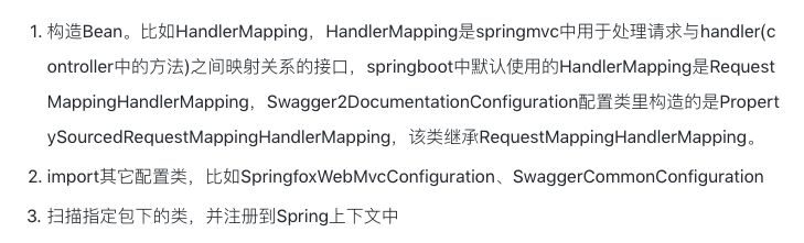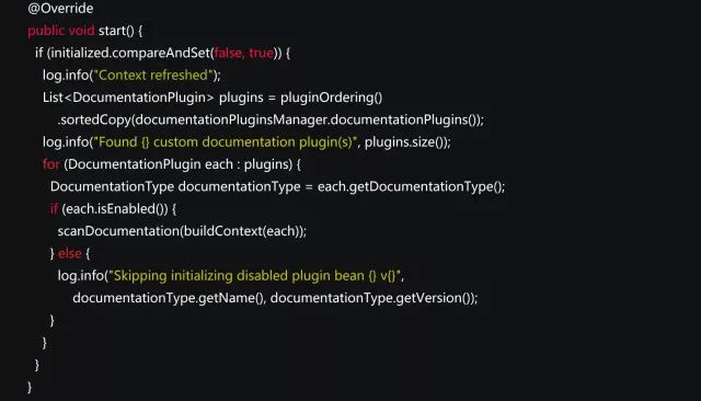 DocumentationPluginsBootstrapper启动类也会在之前提供的配置类中被扫描出来。它实现了SmartLifecycle接口,在start方法中,会获取之前初始化的所有documentationPlugins(也就是Spring上下文中的所有Docket)。遍历这些Docket并进行scan扫描(使用RequestMappingHandlerMapping的getHandlerMethods方法获取url与方法的所有映射关系,然后进行一系列API解析操作),扫描出来的结果封装成Documentation并添加到DocumentationCache中: