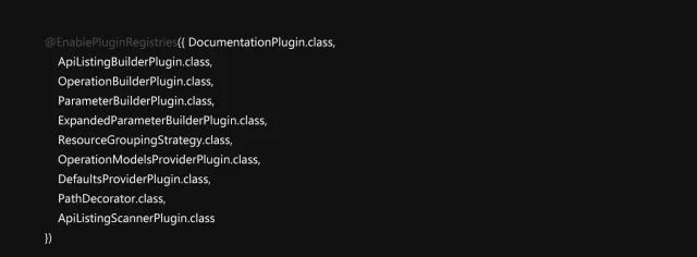 中的@EnablePluginRegistries注解里的DocumentationPlugin这个Plugin,在处理过程中会找出Spring上下文中所有的Docket(Docket实现了DocumentationPlugin接口),并把该集合设置成name为documentationPluginRegistry、类型为OrderAwarePluginRegistry的bean,注册到Spring上下文中。