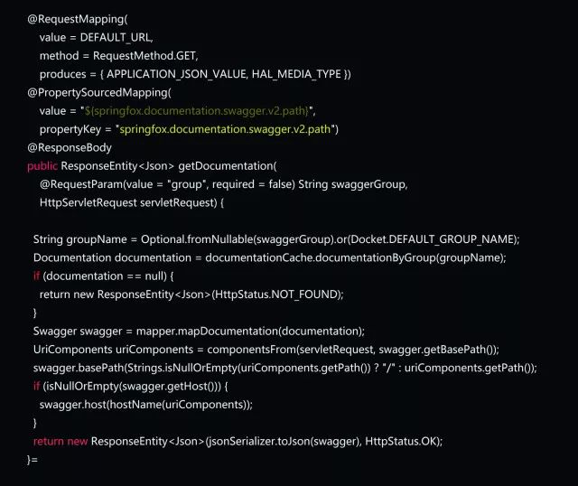Swagger2Controller内部获取文档信息会去DocumentationCache中查找:
