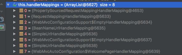 多了一个HandlerMapping,并且优先级高。以下是springboot应用DispatcherServlet的HandlerMapping集合。其中springfox构造的PropertySourcedRequestMappingHandlerMapping优先级最高。优先级最高说明第一次查询映射关系都是走