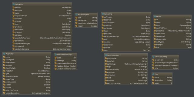其中API列表被封装成ApiListing。ApiListing中又持有ApiDesciption集合引用,每个ApiDesciption都持有一个API集合的引用,Operation也就是具体的接口操作,内部包含了该接口对应的http方法、produces、consumes、协议、参数集、响应消息集等诸多元素。