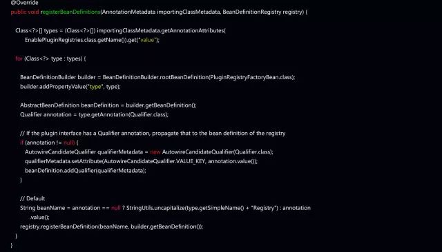 @EnablePluginRegistries注解内部使用PluginRegistriesBeanDefinitionRegistrar注册器去获取注解的value属性(类型为Plugin接口的Class数组);然后遍历这个Plugin数组,针对每个Plugin在Spring上下文中注册PluginRegistryFactoryBean,并设置相应的name和属性。