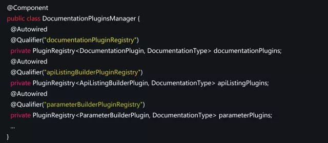 DocumentationPluginsManager类会在之前提到过的配置类中被扫描出来,它内部的各个pluginRegistry属性都是