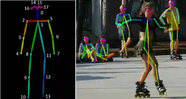 图:左:COCO 关键点格式的人体骨架。右:将骨架映射到人体图片上。(图片来源:https://github.com/CMU-Perceptual-Computing-Lab/openpose)
