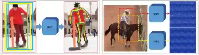 RMPE(https://arxiv.org/abs/1612.00137)是一个流行的自顶向下姿态估计算法。该论文的作者认为,自顶向下方法的性能通常依赖于人体检测器的精度,毕竟人体姿态估计是在检测器检出的框的区域内进行的。因此,错误的定位和重复的候选框会使姿态检测算法的性能降低。