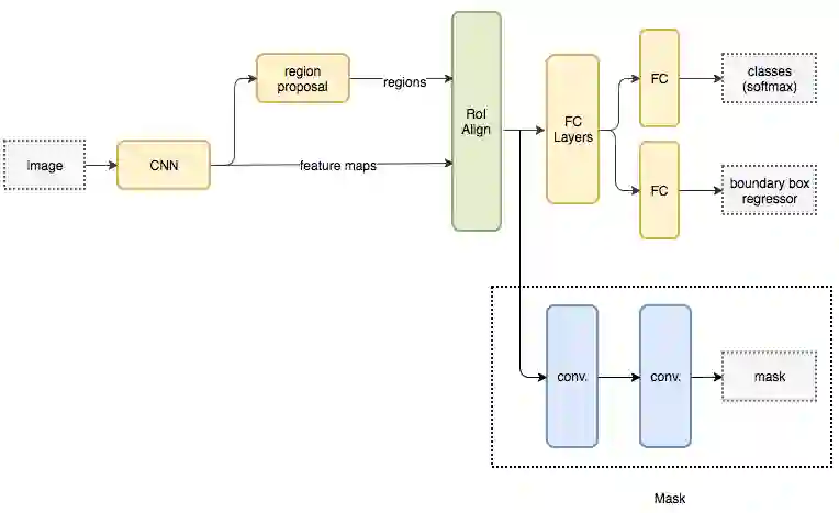 其基本架构首先使用 CNN 从图像中提取特征图。这些特征接着被用于一个区域候选网络(Regin Proposal Network, RPN)来为各个对象生成候选框。候选框会从 CNN 提取出的特征图中选取一个区域。由于候选框可能会有多种尺寸,网络接下来会采用一个层,称为 RoIAlign,用来减小特征图的尺寸,使它们具有相同的尺寸。现在,抽取出的特征被传给平行的 CNN 分支,用来输出候选框和分割 mask 的最终预测。